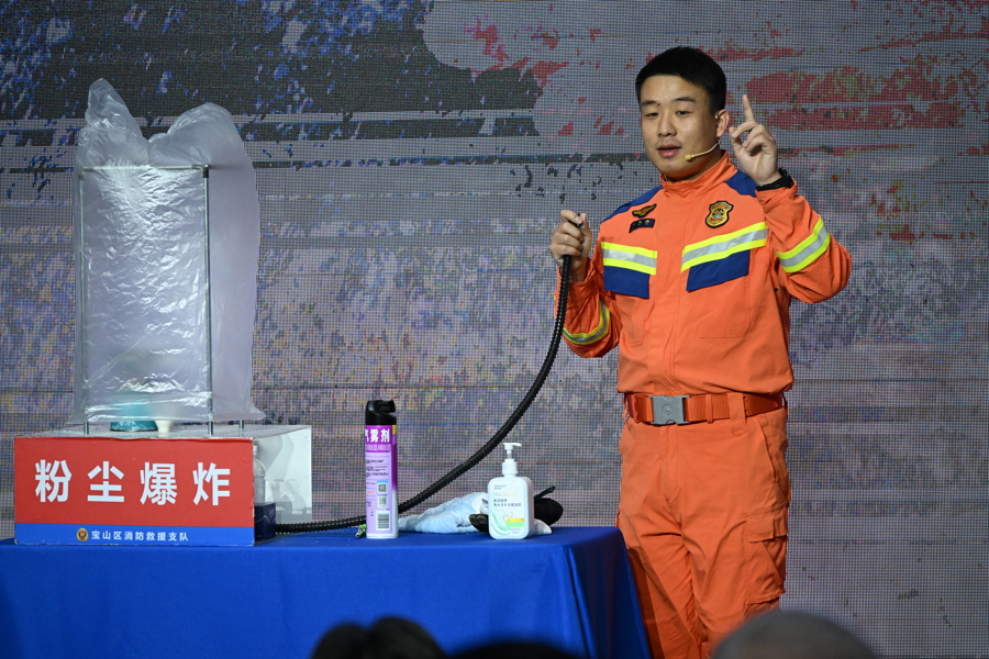 活动现场,首届上海市消防科普讲解大赛一等奖获得者、来自上海市宝山区消防救援局的消防员马俊涛通过三个扣人心弦的实验,演示了日常生活中消毒凝胶、杀虫喷雾剂的潜在危险,以及粉尘爆炸的原理。